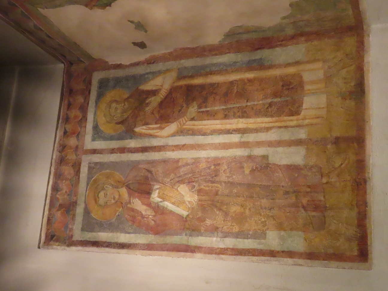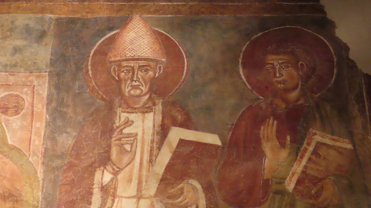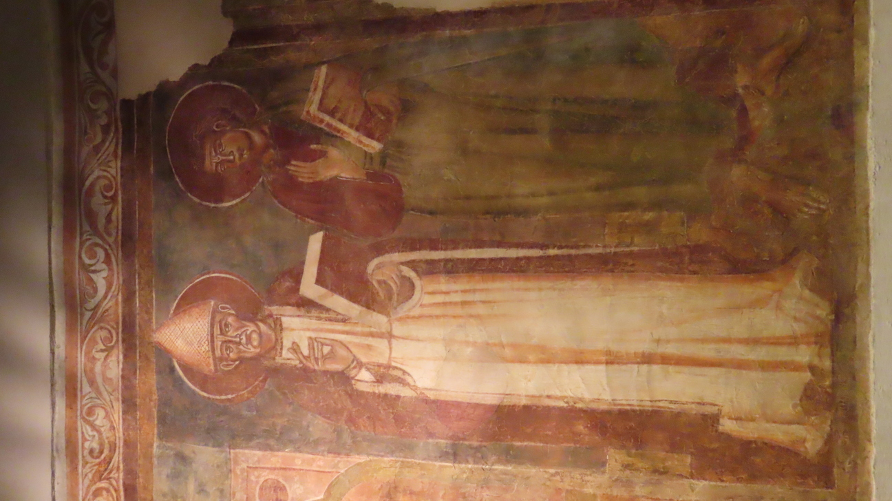 - Due Santi non identificati. Uno è forse un santo vescovo con copricapo intrecciato
