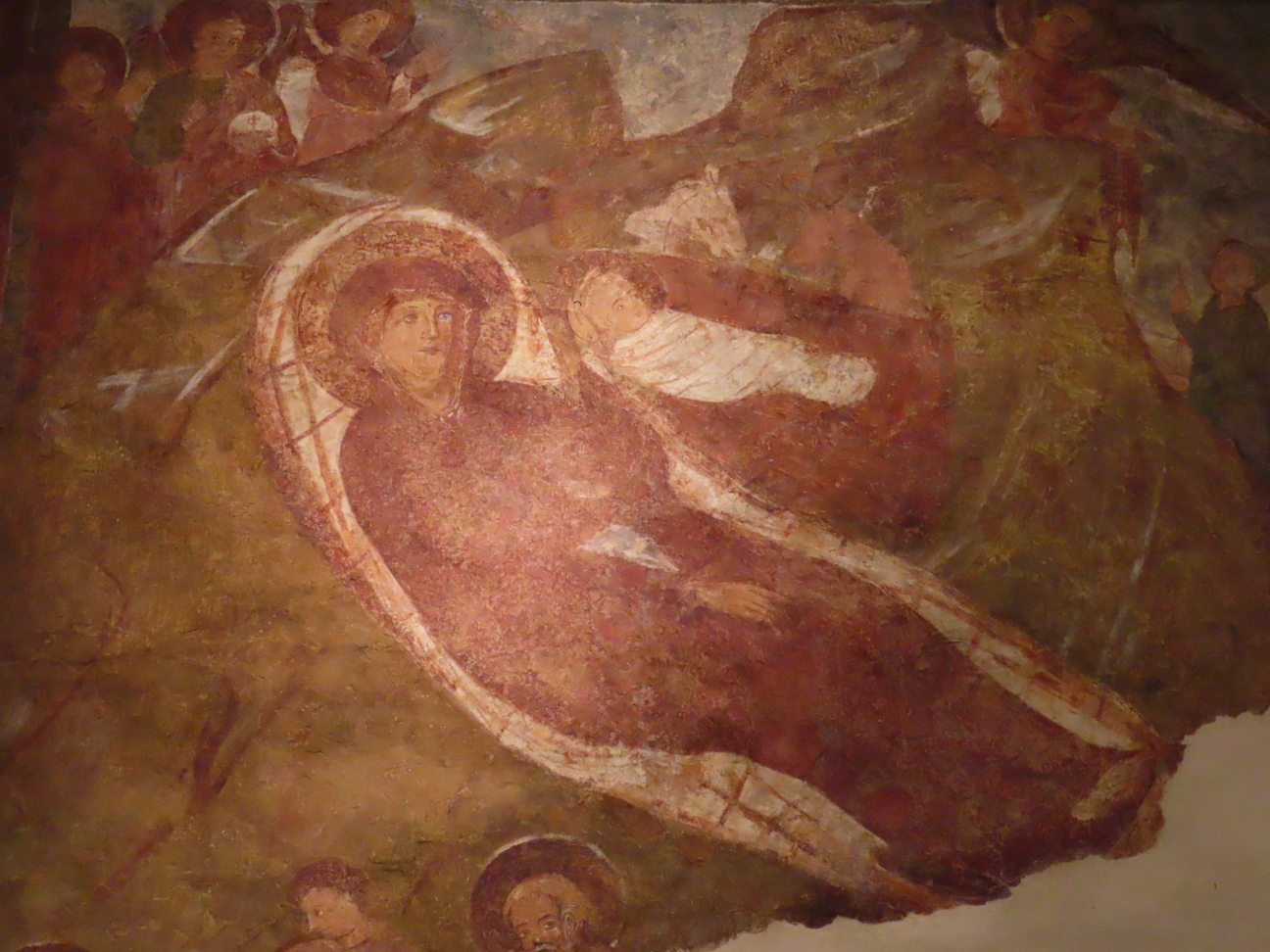 Angelo con le ali spiegate che annuncia ai pastori la nascita di Cristo. San Francesco e San Michele Arcangelo. La figura di S. Michele è stata cancellata per aprire il vano della finestra (sec. XVII°), resta la bilancia per pesare il bene e il male.