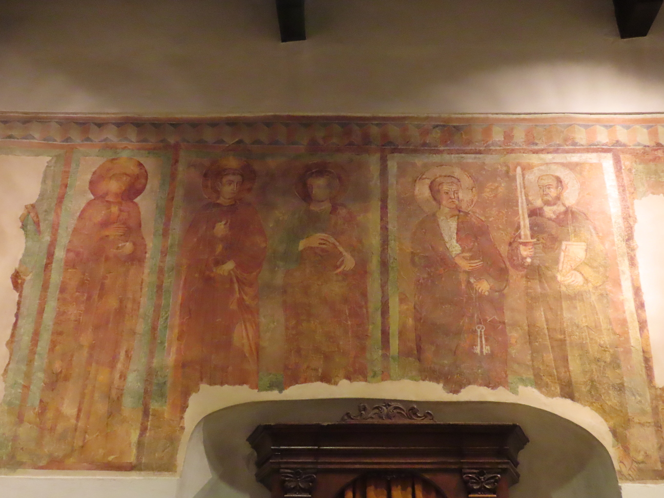 Ciclo pittorico trecentesco, vario e di complessa ideazione, unico nell’area bellunese. Gli affreschi, ricoperti dello scialbo sin dal XVII° secolo, furono riscoperti nei primi anni del ‘900 e si diede inizio al loro restauro che durò, con varie interruzioni, per tutto il secolo scorso. Il ciclo pittorico originario doveva ricoprire tutte le pareti dell’aula, ma i lavori di modifica furono eseguiti dopo gli affreschi, compromettendo la decorazione.